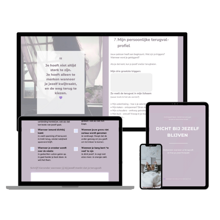 Met korte stappen, herkenbare zinnen en invulpaginaโs voor jouw eigen reacties. Zodat je niet meer verdwijnt in oude patronen op het moment dat het spannend wordt.